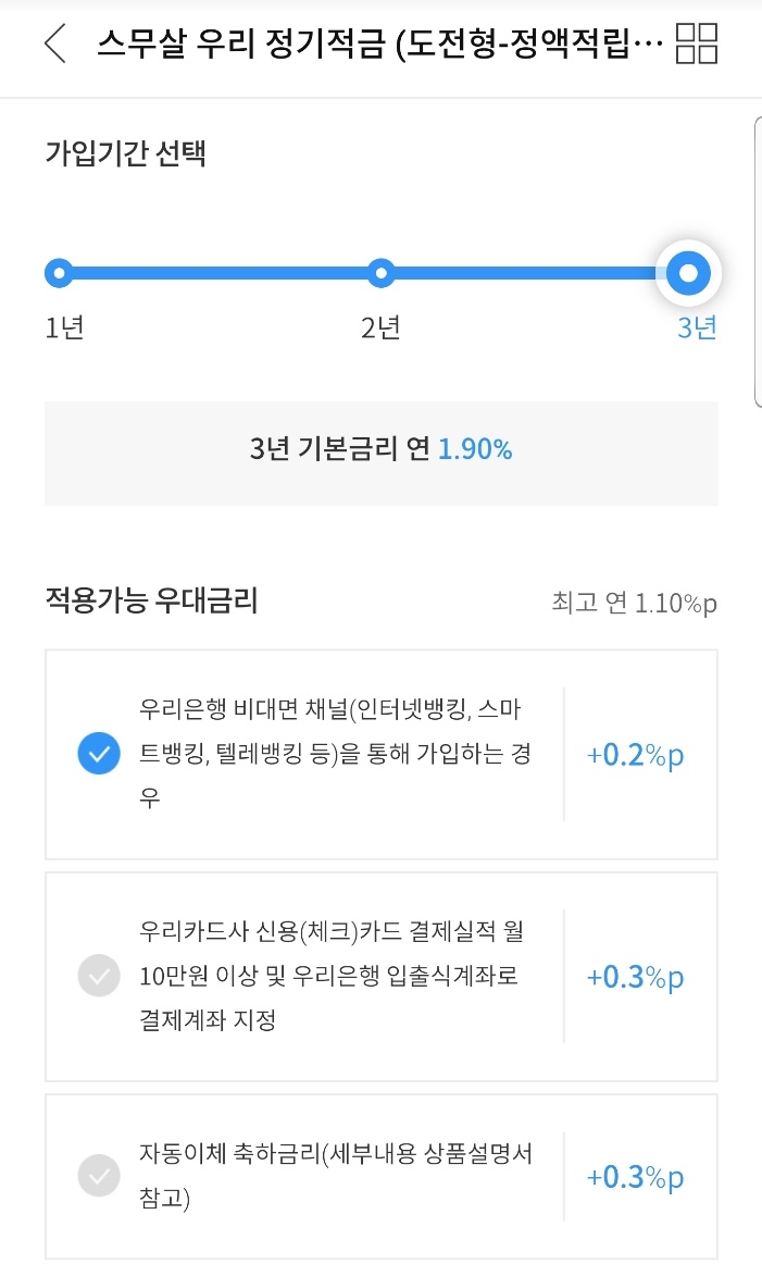 3년으로 했을때 기본금리가 1.9%입니다. 여기서 우대금리를 받아야 하는데요. 우리은행 스마트뱅킹, 인터넷뱅킹으로 가입하면 0.2% / 우리카드10만원 이상 사용하면서 결제계좌 지정시 0.3% / 자동이체축하금리 0.3%까지 해야 총 3프로 이자를 받을 수 있습니다.