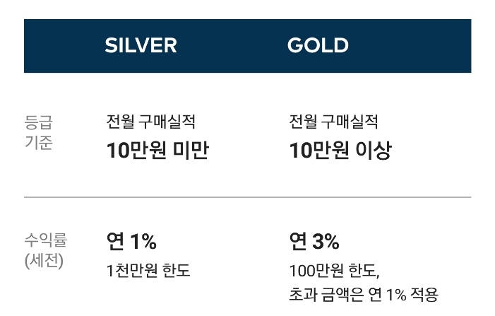 현재는 가입자 모두 골드 등급인데요. 2020년 9월 1일부터는 위와 같이 SILVER랑 GOLD 등급으로 나뉘어집니다. 기준은 상당히 간단합니다. 전월 구매실적 10만원 이상이면 됩니다. 개인적으로 30만원 이상 사용하다보니 충분히 충족을 될꺼 같습니다. 그러면 연3% 혜택이 제공되는데요. 100만원 초과된 금액은 1%로 되는 점 알아두시면 되겠습니다.