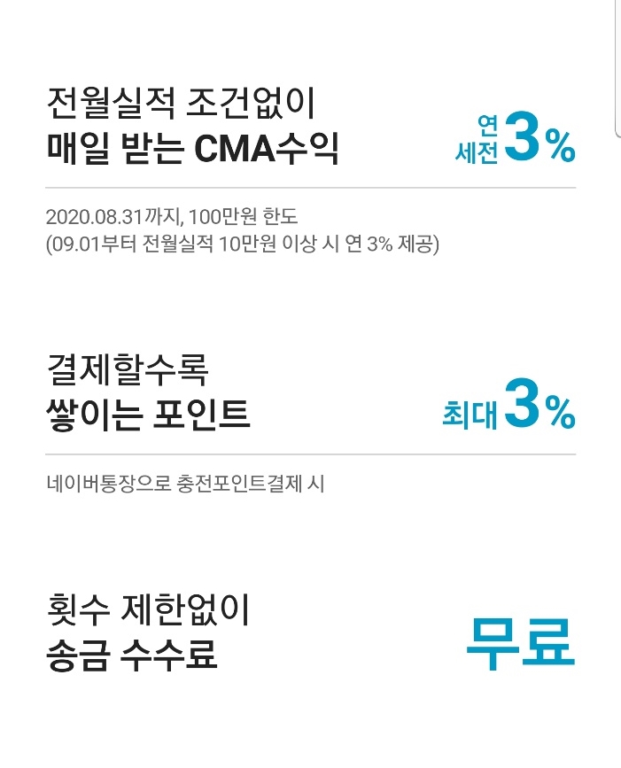 주의할 점은 CMA RP형 계좌로 예금자보호가 안된다는 점인데요. 이 부분은 큰 문제가 될꺼 같지는 않습니다. 네이버통장은 쇼핑용도로 주로 사용예정이며 50~100만원 정도 입금을 하면서 경제생활을 할꺼 같습니다.