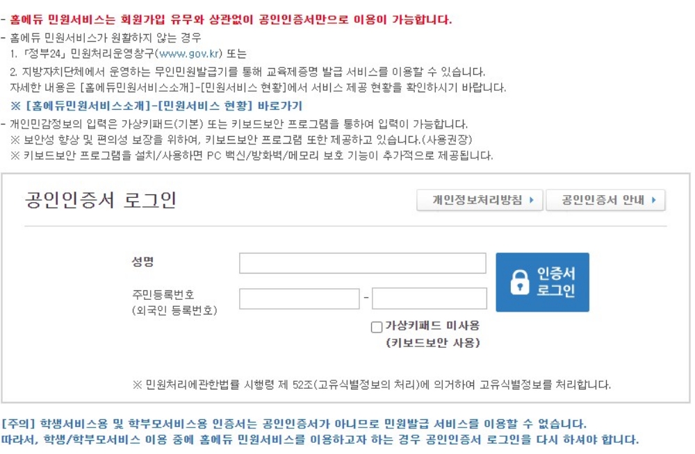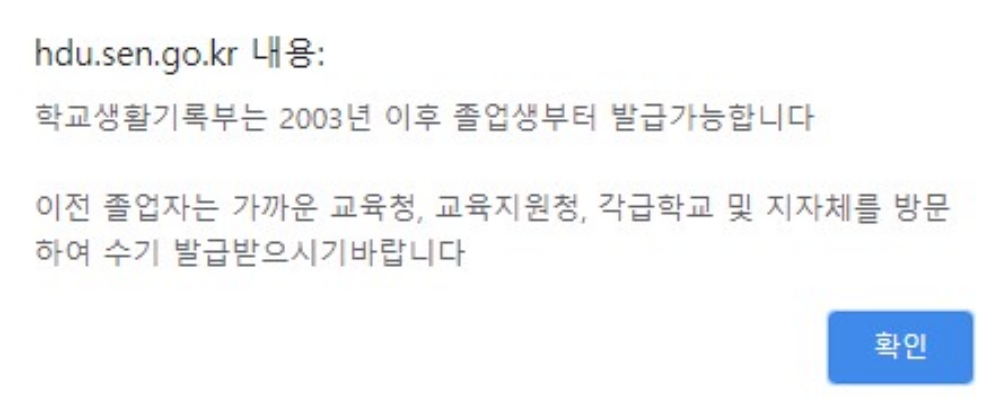 마지막으로 드리고 싶은 말씀은 현재는 2003년 이전 졸업생은 인터넷 발급이 어렵고 근처 교육청, 학교를 방문을 해야만 하는 상황이니 착오 없으시길 바랍니다.