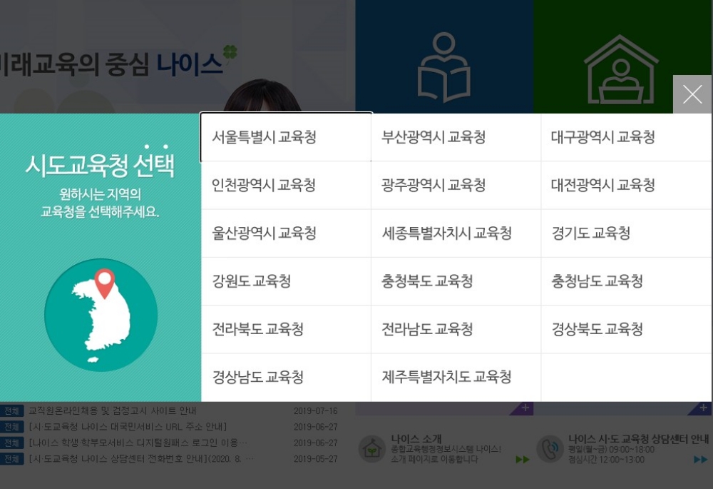 위와같이 시도교육청 선택화면이 보이고 졸업한 고등학교 지역을 선택하면 되겠습니다.