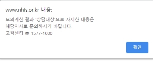 자격, 가입자 종류, 가구원수, 의료비, 본인부담금, 민간보험 등의 내용을 입력 후에 결과 확인을 누르면 아래와 같은 메세지를 확인할 수 있습니다.