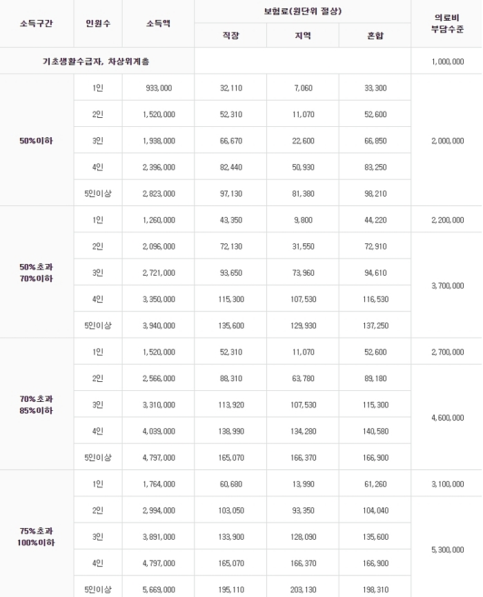 1) 기준 중위소득 100% 이하 (소득 하위 50%) 여야 하며 아래와 같이 의료비 부담 수준이 달라지니 확인하시기 바랍니다.