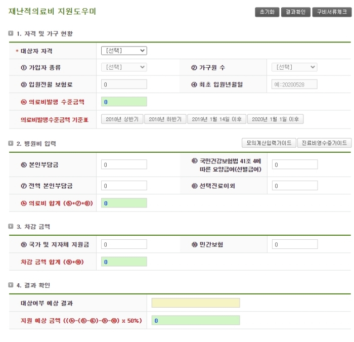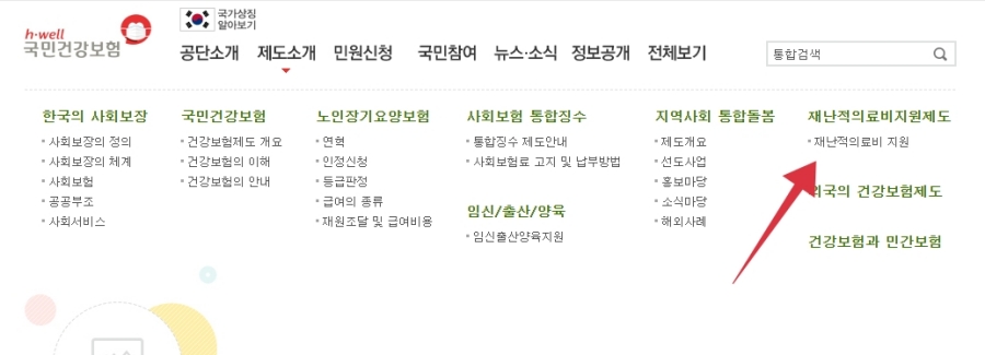 우선 국민건강보험 홈페이지에 접속을 합니다. 후에 제도 소개 > 재난적 의료비 지원제도로 들어갑니다. 그러면 아래와 같이 지원 도우미 입력란을 확인할 수 있습니다.
